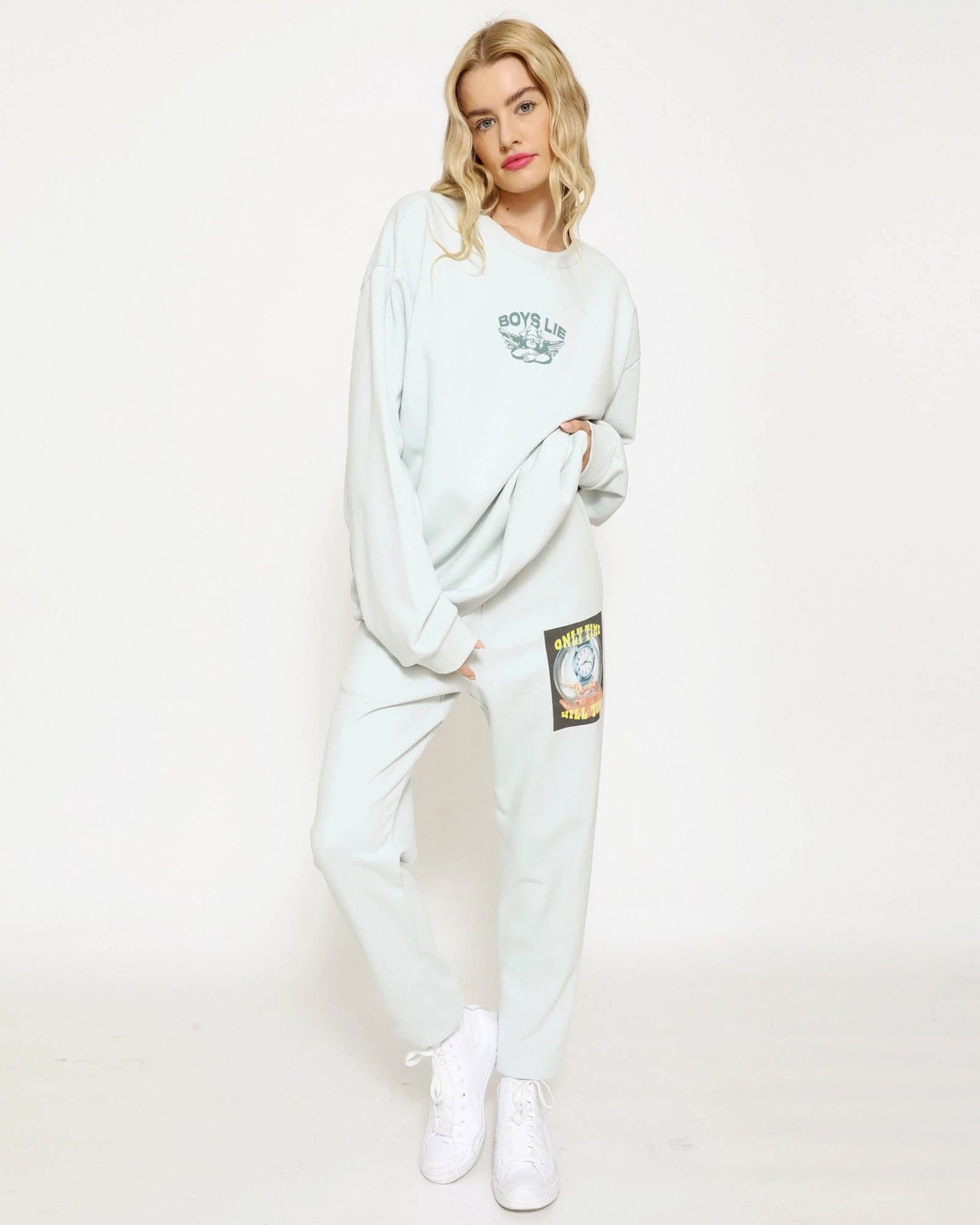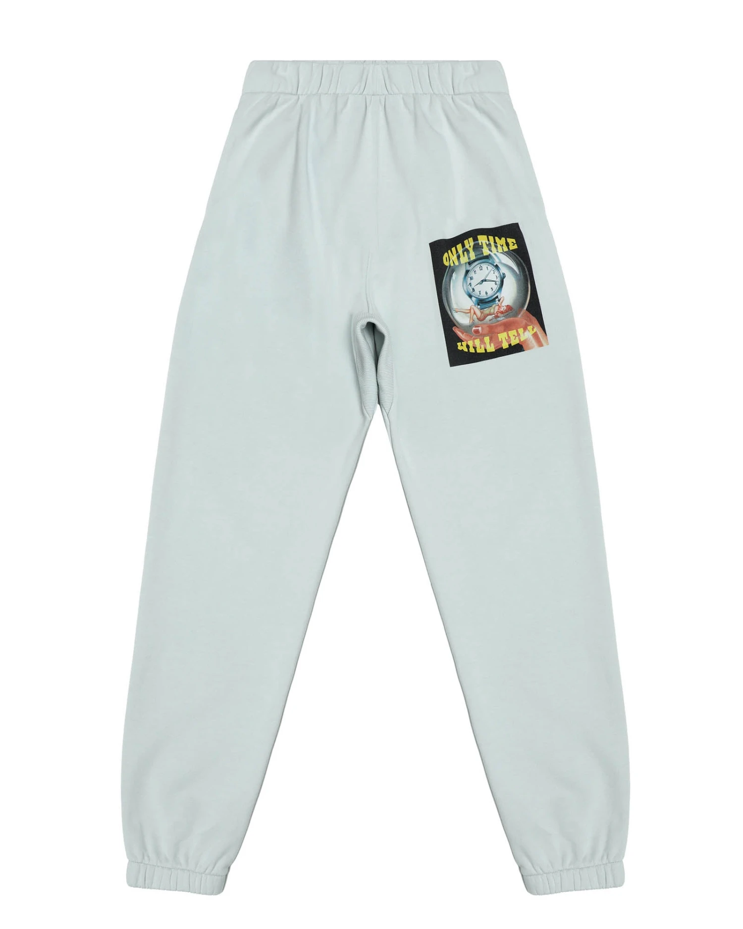 Our new heavyweight french terry fabric in baby blue. High rise sweatpants with back and side pockets, elastic waistband and cuffs.